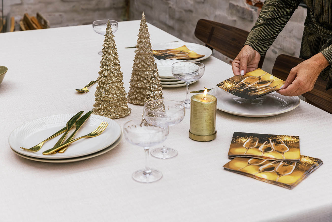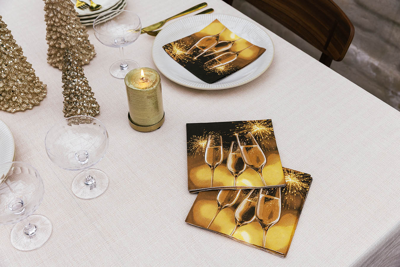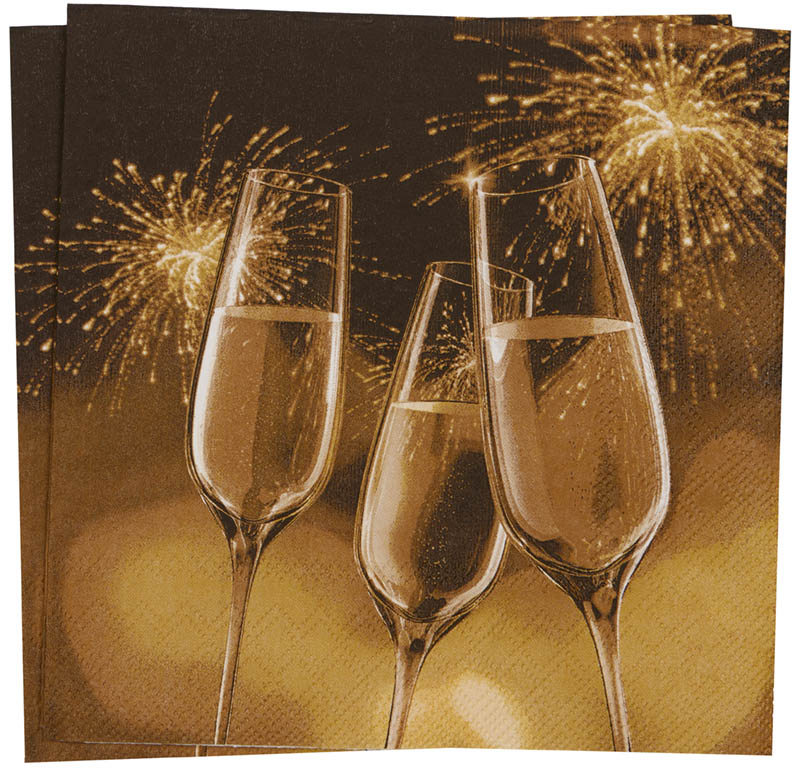 Skål inn det nye året med festlige servietter på bordet! Papirserviettene er dekorert med fyrverkerimønster og champagneglass – perfekte til borddekkingen på nyttårsaften.