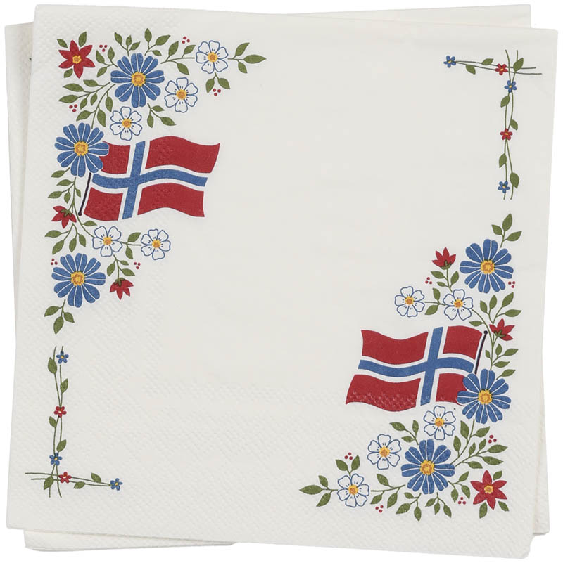 Vakre papirservietter prydet med klassiske 17. mai-blomster og flagg. Serviettene gir bordet et stilfullt og festlig preg, og setter tonen for en gledelig feiring av nasjonaldagen.