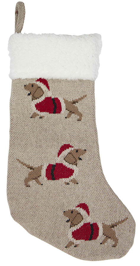 Morsom julestrømpe pyntet med søte hunder. Strømpen har et mykt yttertrekk av strikket bomull, en innside av filt, og en koselig, pusete kant øverst. Heng den opp over peisen, på sengegavlen, eller på en krok i rommet – og gled deg til å se hva nissen har fylt den med!