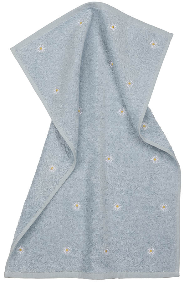 Dekorativt håndkle brodert med margeritter. Ideelt som håndhåndkle eller gjestehåndkle på badet, men kan også brukes på kjøkkenet. Mønsteret og den lyseblå fargen gir en søt og vårlig touch – et lite smykke som lyser opp rommet.