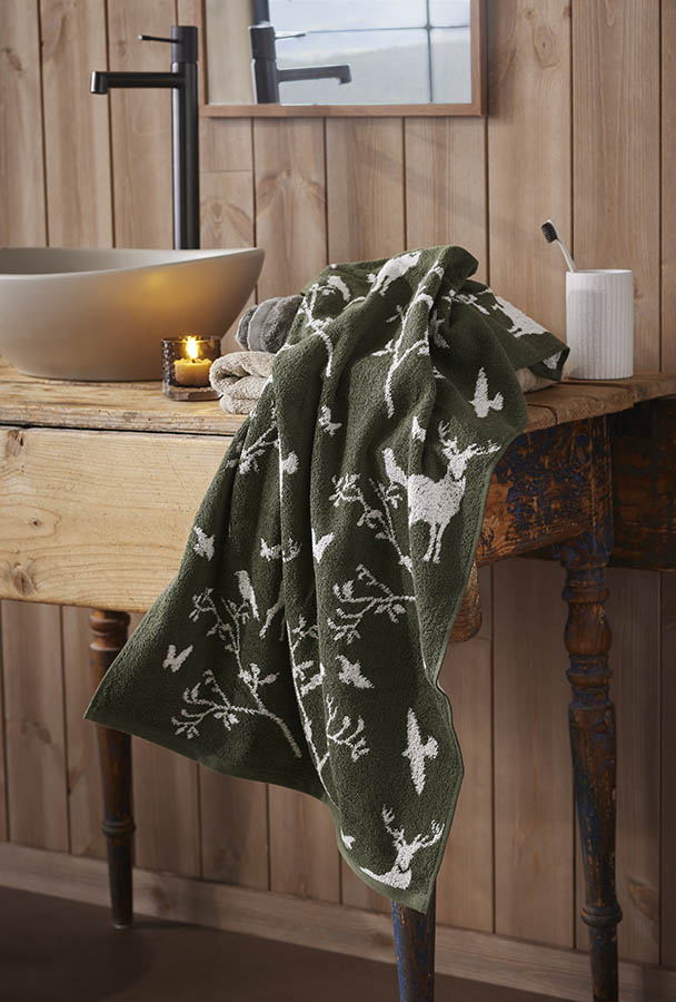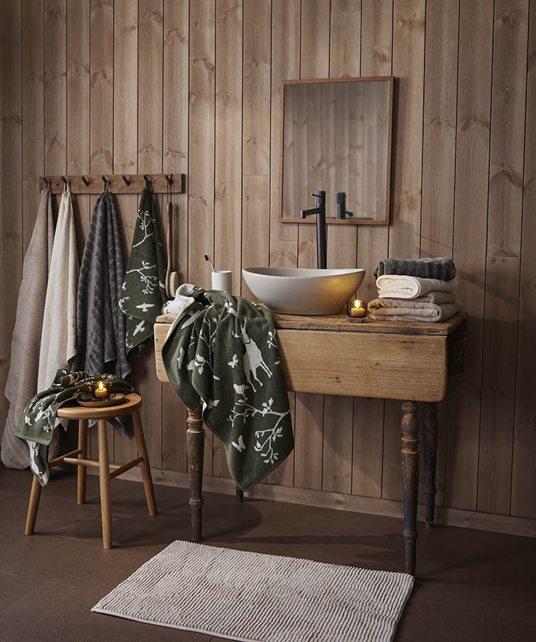 Håndkle i mellomtykk bomullsfrotté med god absorberingsevne. Håndkleet har et skogspinspirert mønster som skaper både blikkfang og en harmonisk naturfølelse på badet. Perfekt for deg som ønsker et unikt design kombinert med høy kvalitet.