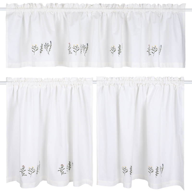 Hvite cafégardiner brodert med markblomster. Designet er inspirert av tidlige vårtegn og skaper et vakkert blikkfang i vinduet. Gardinsettet består av en kappe og to undergardiner. Alle fagene har løpegang og kan tres direkte på stangen.