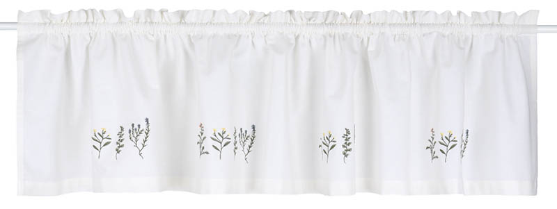 Hvit gardinkappe brodert med markblomster. Designet er inspirert av tidlige vårtegn og skaper et vakkert blikkfang i vinduet. Kappen har løpegang og kan tres direkte på en gardinstang, gardinspiral eller spennstang.