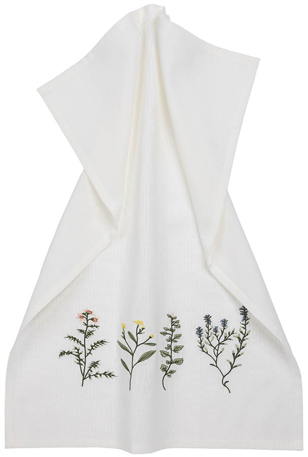 Kjøkkenhåndkle med et enkelt og delikat motiv, brodert med fire markblomster. Designet er inspirert av tidlige vårtegn og skaper et vakkert blikkfang på kjøkkenet – både hjemme og på hytta.