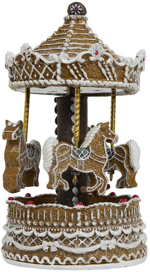 Nydelig spilledåse formet som en tivolikarusell med pepperkake-look. Skru på toppen av karusellen, så spiller den den nostalgiske julesangen «Jingle Bells». Et dekorativt element som sprer julefølelse og nostalgi i alle rom. Samle gjerne flere, miks med annen julepynt, og skap ditt eget magiske juletivoli.