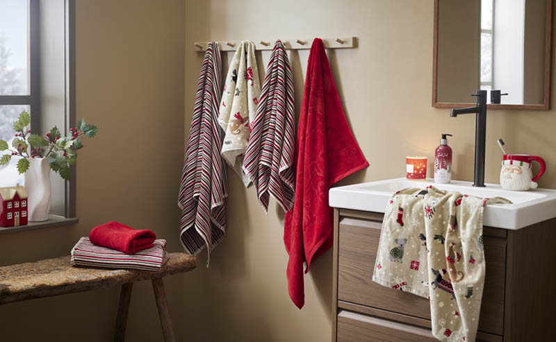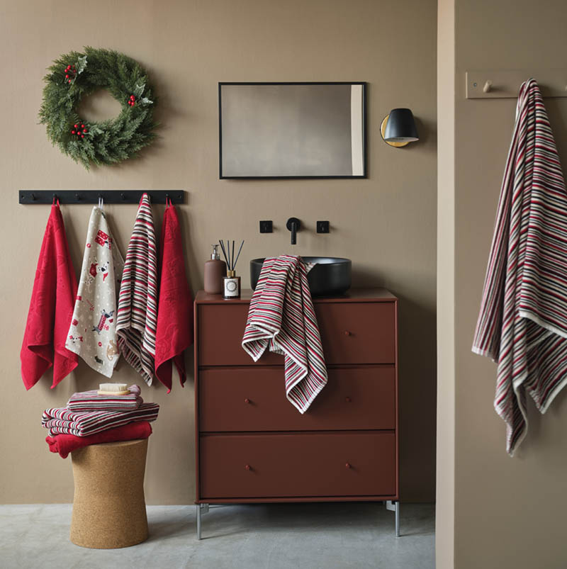 Håndkle i varm julerød farge. Håndkleet er laget i myk velour og er preget med sjarmerende gnomer. Et design som skaper en klassisk og elegant julestil på badet.