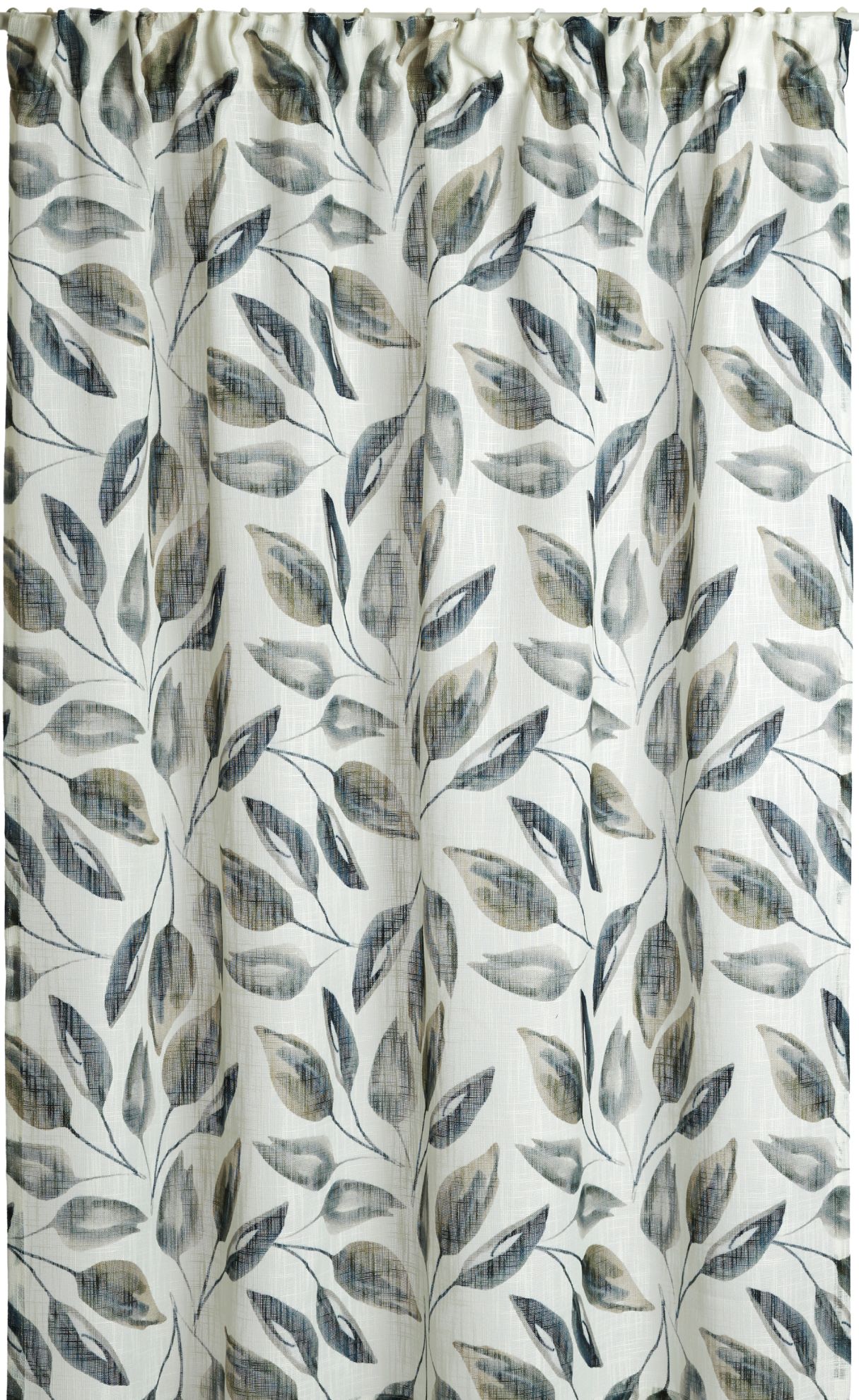 Mellomtykk gardin med bladmønster i blå og grønne toner. Lettstelt kvalitet og vakkert fall. Når lyset siles gjennom stoffet, blir konturene av mønsteret ekstra tydelige, noe som skaper et blikkfang og en harmonisk atmosfære i rommet. Gardinen henges opp med rynkebåndskroker, enten på stang eller skinne.