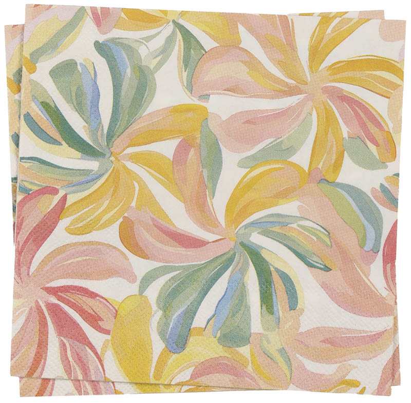 Papirservietter med dekorativt mønster i akvarellfarger. Det lekne designet gir borddekkingen et friskt og solfylt uttrykk, og leder tankene til sydligere strøk og lange måltider i sommervarmen.