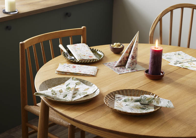 Vakre papirservietter med detaljert bladmønster i naturtro farger. Det forseggjorte designet bringer naturen inn i hjemmet og skaper en varm og innbydende stemning rundt det dekkede bordet – perfekt til både hverdagsmåltider, festlige anledninger og som en liten gave.