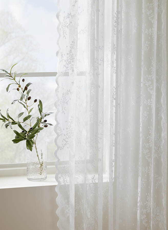 Nostalgisk blondegardin, også kalt trådgardin, med vakkert blomstermønster. Lett og luftig kvalitet med fint fall. Gardinen har transparent gardinbånd og henges opp med rynkebåndskroker, enten på skinne eller stang. Du kan også bruke kanalen for å tre gardinen direkte på en gardinstang.