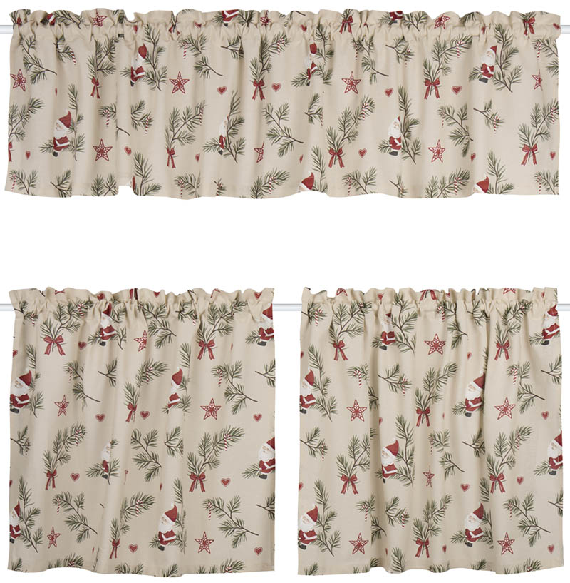Beige kjøkkengardiner prydet med søte nisser, hjerter og granbar – et koselig design som skaper en nostalgisk stemning på julekjøkkenet. Gardinsettet består av en kappe og to undergardiner. Alle fagene har løpegang og kan tres direkte på gardinstangen. Kombiner gjerne med andre produkter fra samme serie.