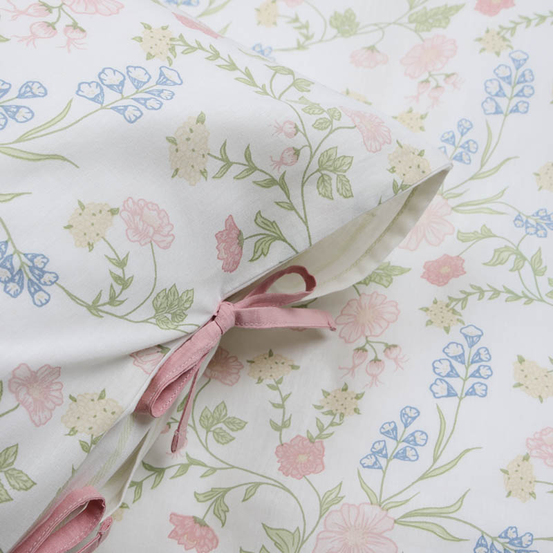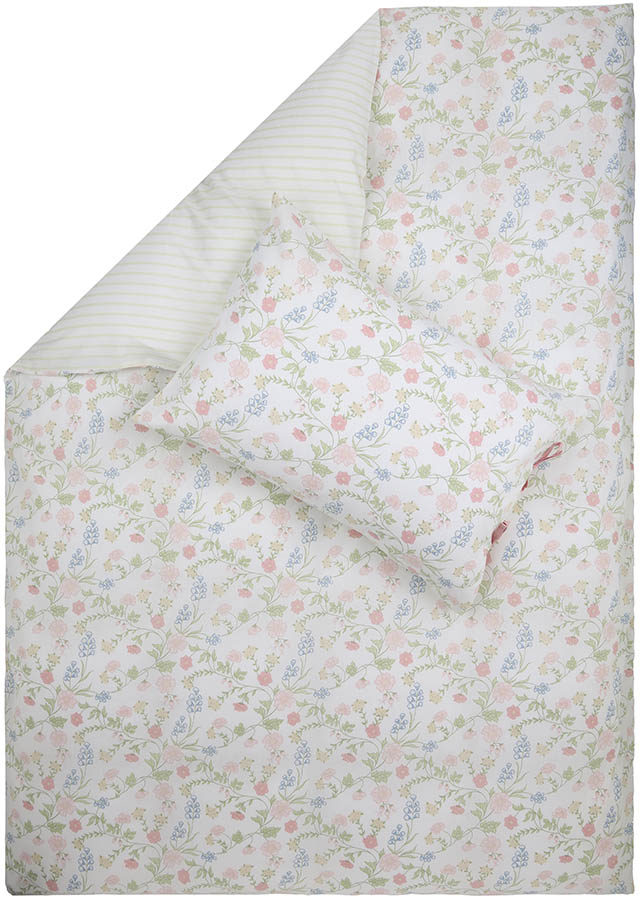 Mykt og slitesterkt sengesett i bomull. Dynetrekket er tosidig, med et floralt mønster på ene siden og striper på andre siden. Putevaret lukkes med fine knytebånd på siden – en unik detalj som gir det lille ekstra. Det søte designet gir en følelse av spirende vår, og sengesettet passer like godt på hytta som hjemme.