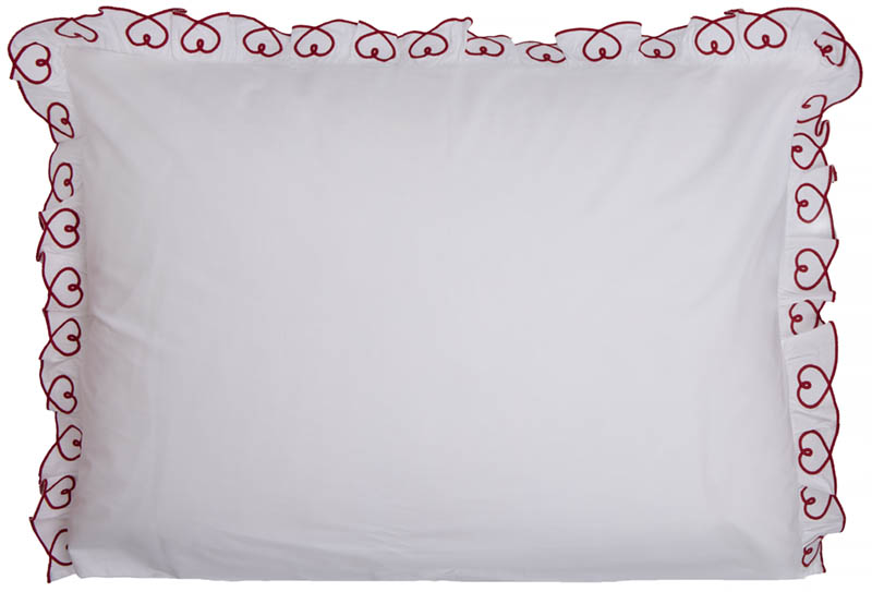 Vakkert putevar med bølgete kant og broderte hjerter – et sjarmerende design som skaper en lun og koselig atmosfære, med et snev av hjertevarm nostalgi.