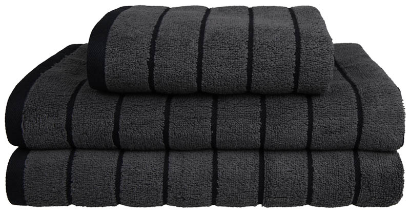 Mellomtykt håndkle med vevd stripemønster i klassiske, mørke nyanser. De svarte stripene mot det grå gir et stilrent og sofistikert uttrykk som passer perfekt på ethvert moderne baderom. Et ideelt valg for deg som setter pris på både kvalitet og design.