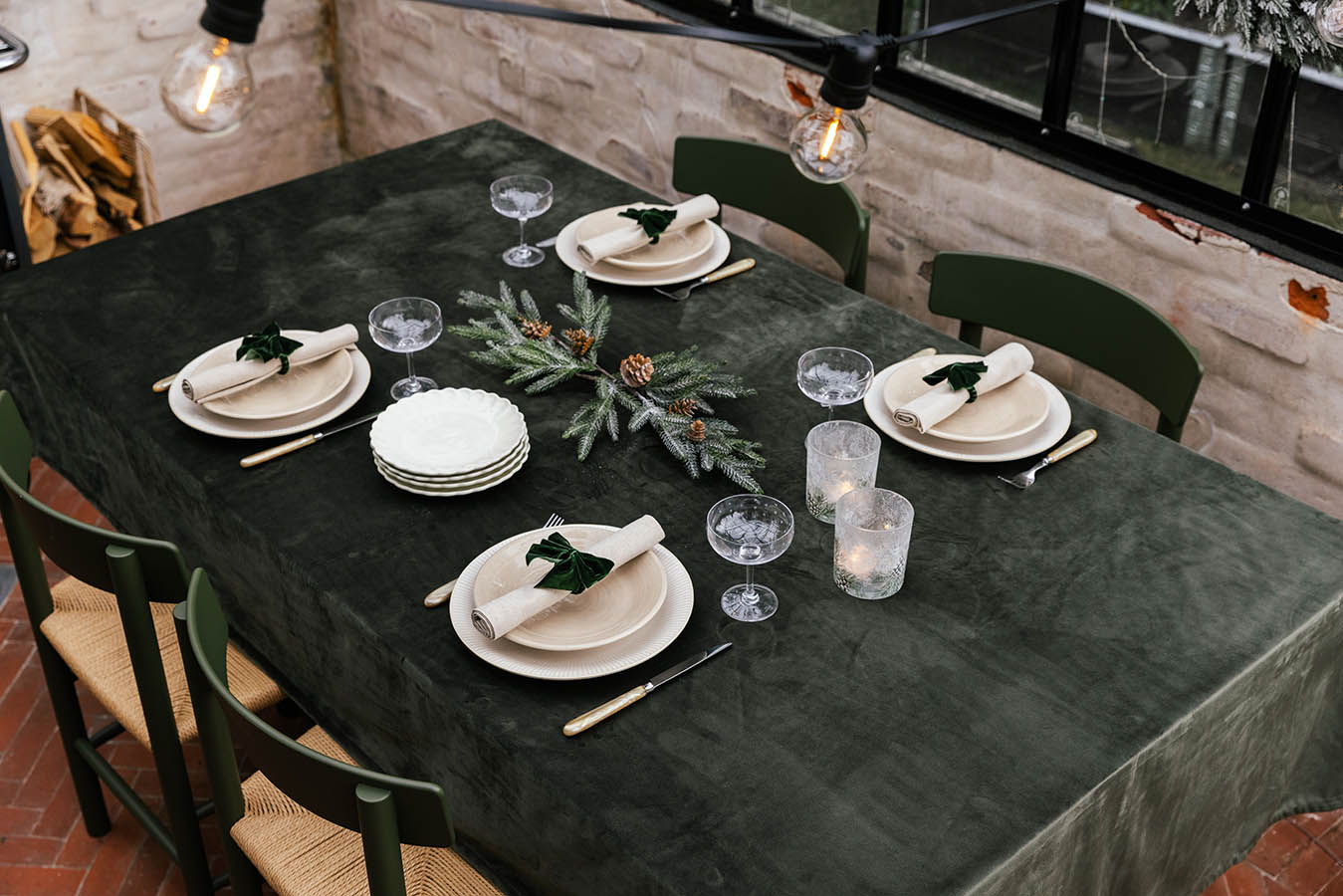 Dekk et stemningsfullt festbord med tekstiler som skaper en varm og innbydende atmosfære. Hollie duk er laget av tykk og lettstelt velour, med et vakkert fargespill som gir dybde og liv til den dype grønnfargen. Duken ligger tungt og glatt på bordet uten å krølle seg. En elegant festduk du kan hente frem år etter år.
