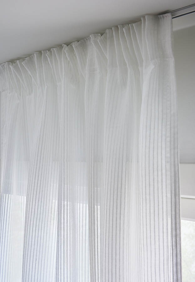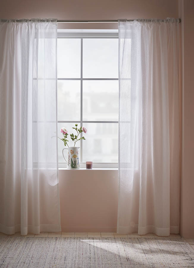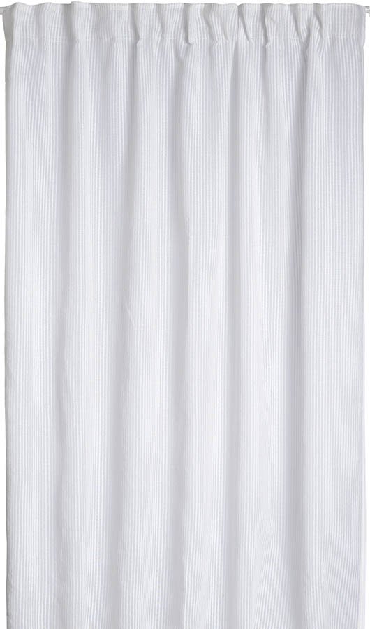 Tynn og luftig gardin med vevde striper. Gardinen slipper inn lys samtidig som den hindrer innsyn. En tidløs og klassisk gardin du vil trives med i lang tid. Den henges opp med rynkebåndskroker, enten på skinne eller stang. Kommer i to lengder, hvorav den ene er ekstra lang – perfekt når du ønsker å henge gardiner fra tak til gulv.