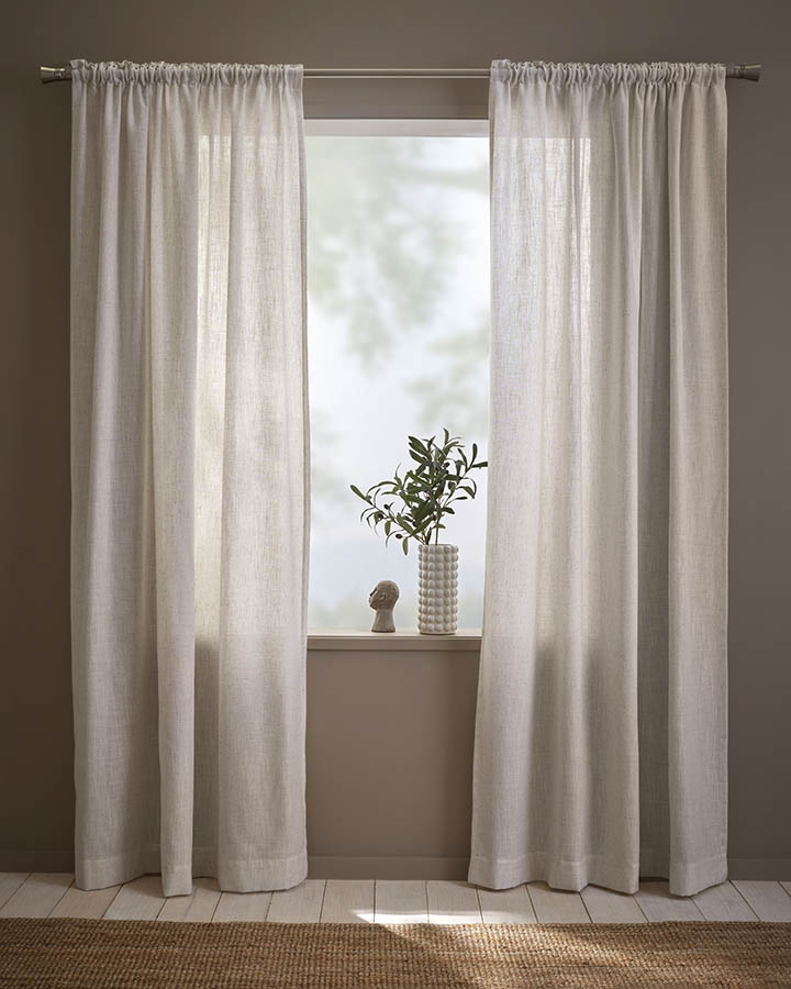 Mellomtykk gardin i linblanding. En tidløs gardin som enkelt kan kombineres med andre farger i hjemmet. Gardinen har multibånd, som gjør at den kan henges opp på flere måter, enten på skinne eller stang. Den kommer i fire lengder, hvorav to er ekstra lange – ideelt når du ønsker å henge gardiner fra tak til gulv.