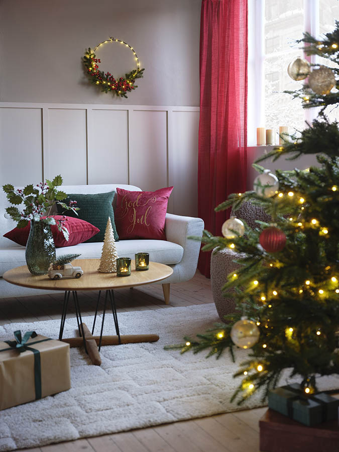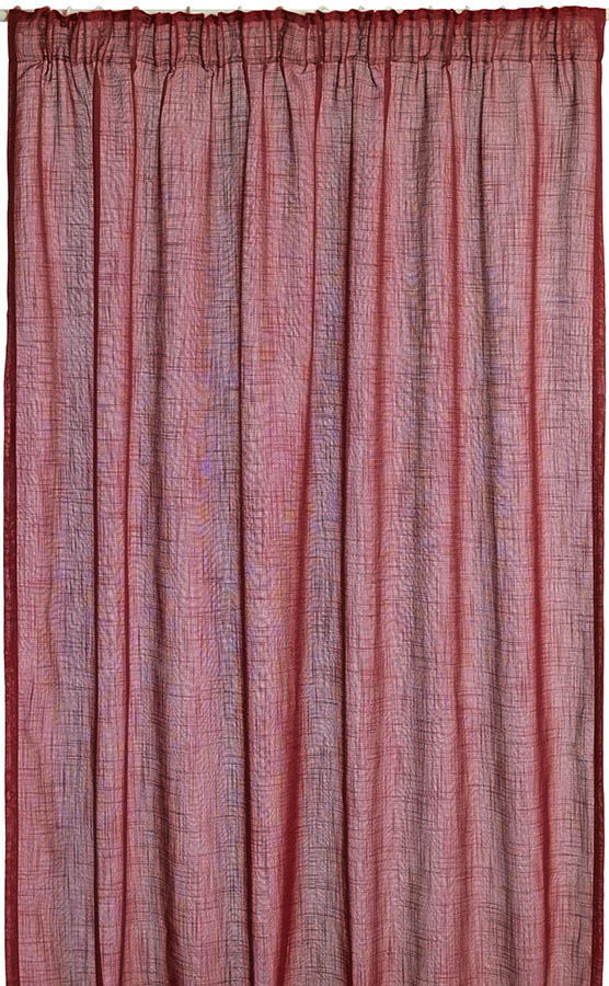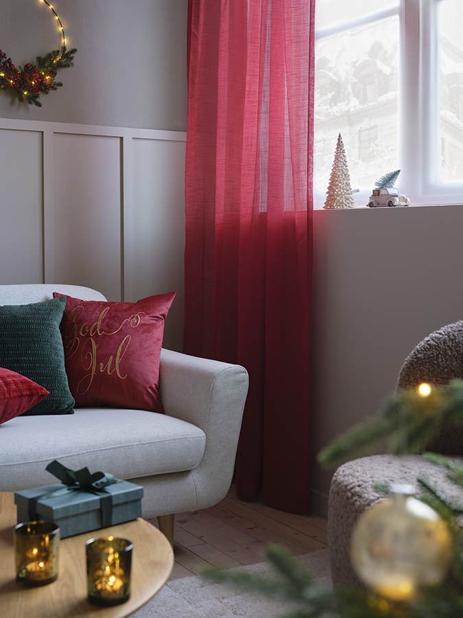 Florlett rynkebåndsgardin i luftig og lettstelt kvalitet. Den julerøde fargen skaper en varm og innbydende atmosfære som setter prikken over i-en i julehjemmet ditt. En tidløs julegardin du kan glede deg over år etter år. Gardinen henges enkelt opp med rynkebåndskroker, enten på gardinstang eller gardinskinne.