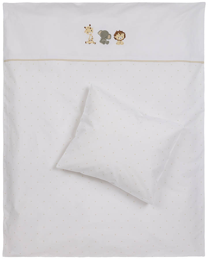 Babysengesett til vugge og barnevogn, laget av myk bomull. Dynetrekket har tre søte jungeldyr brodert på øvre del, mens nedre del og putevaret har et prikkete mønster. Et koselig design med mange fine detaljer. Finnes i flere størrelser.