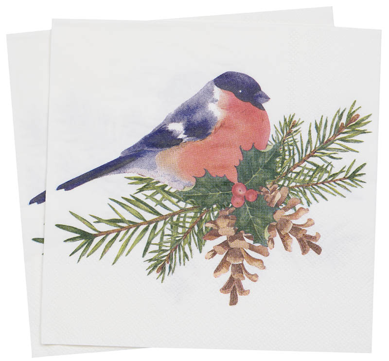Papirservietter med motiv av en vakker dompap – et design som vekker nostalgi og minner oss om nordiske juletradisjoner. Ideelle til borddekking og flotte som gave. Kombiner gjerne med andre produkter fra samme serie.