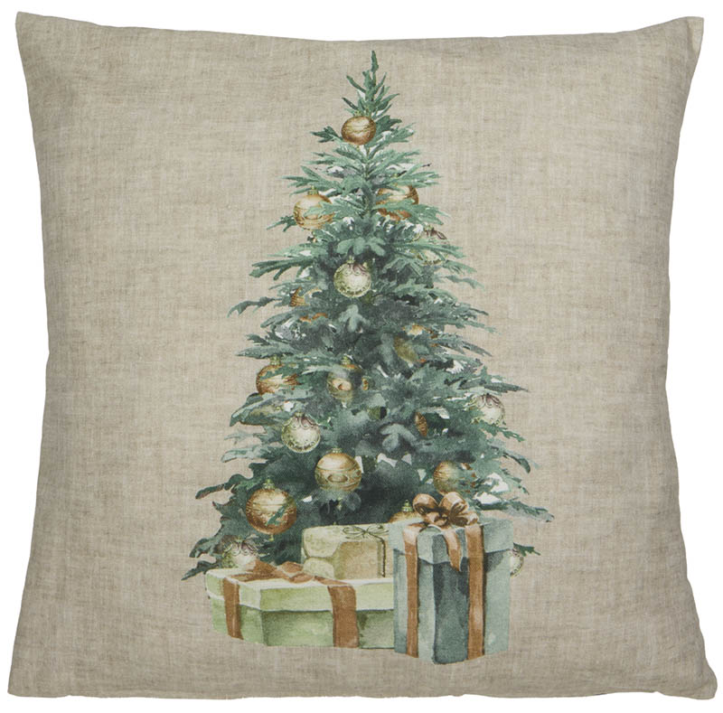 Naturfarget putetrekk dekorert med et elegant juletremotiv. Perfekt for å tilføre en lun og naturlig stemning i hjemmet, både i adventstiden og gjennom hele julehøytiden.