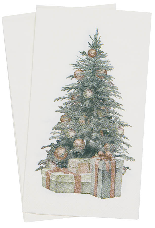 Rektangulære juleservietter prydet med et pyntet juletre i klassisk stil. Designet gir julebordet et elegant uttrykk, og den avlange formen gjør det enkelt å plassere serviettene enten på eller ved siden av tallerkenen for en pen og enkel borddekking.
