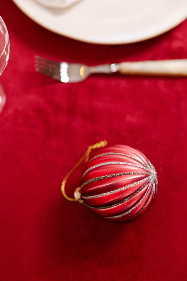 Vakker julekule i klassisk stil med dyp rød farge, dekorert med glitter og gullperler som gir treet et elegant uttrykk. Kulen kan også henges i vinduet, brukes som bordpynt, eller settes på et fat sammen med annen pynt.