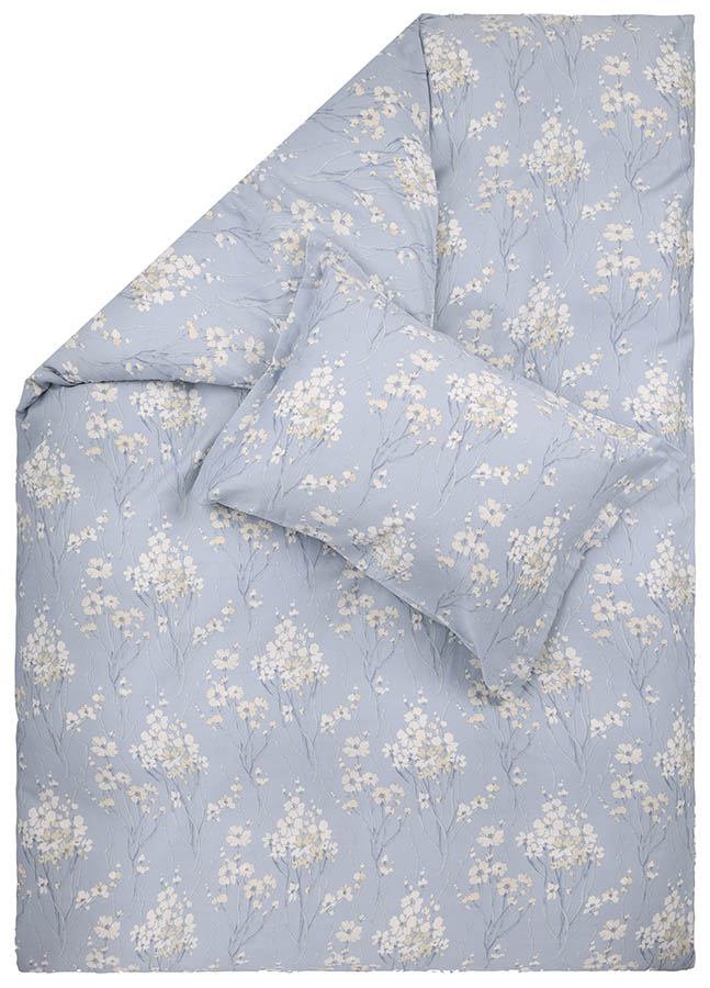 Mykt og behagelig sengesett i bomullssateng med et vakkert floralt mønster på lyseblå bunn. Putevaret har en dekorativ vinge rundt kanten, og det iøynefallende designet skaper en vårlig atmosfære på ethvert soverom. Perfekt for deg som ønsker å kombinere komfort med unik og elegant design.
