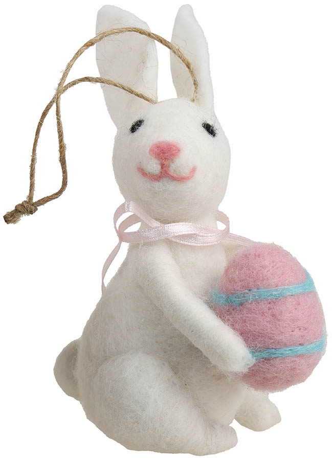 Koselig påskehare med et påskeegg i fanget. Kan henges opp eller sitte.