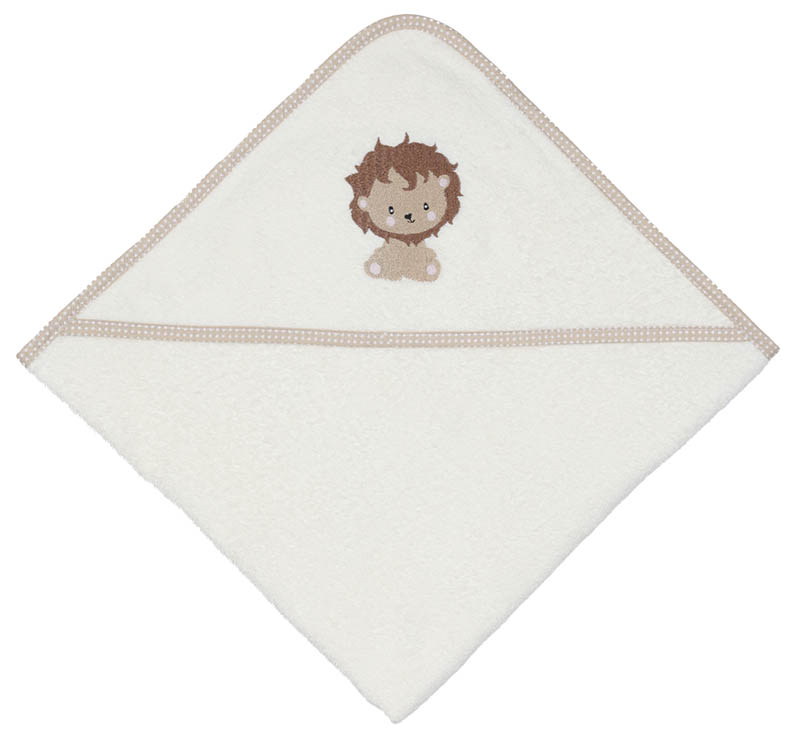 Hettehåndkle i myk og absorberende bomullsfrotté med et sjarmerende, brodert løvemotiv på hetten. Ideelt for å holde barnet varmt og tørt etter bad og stell.