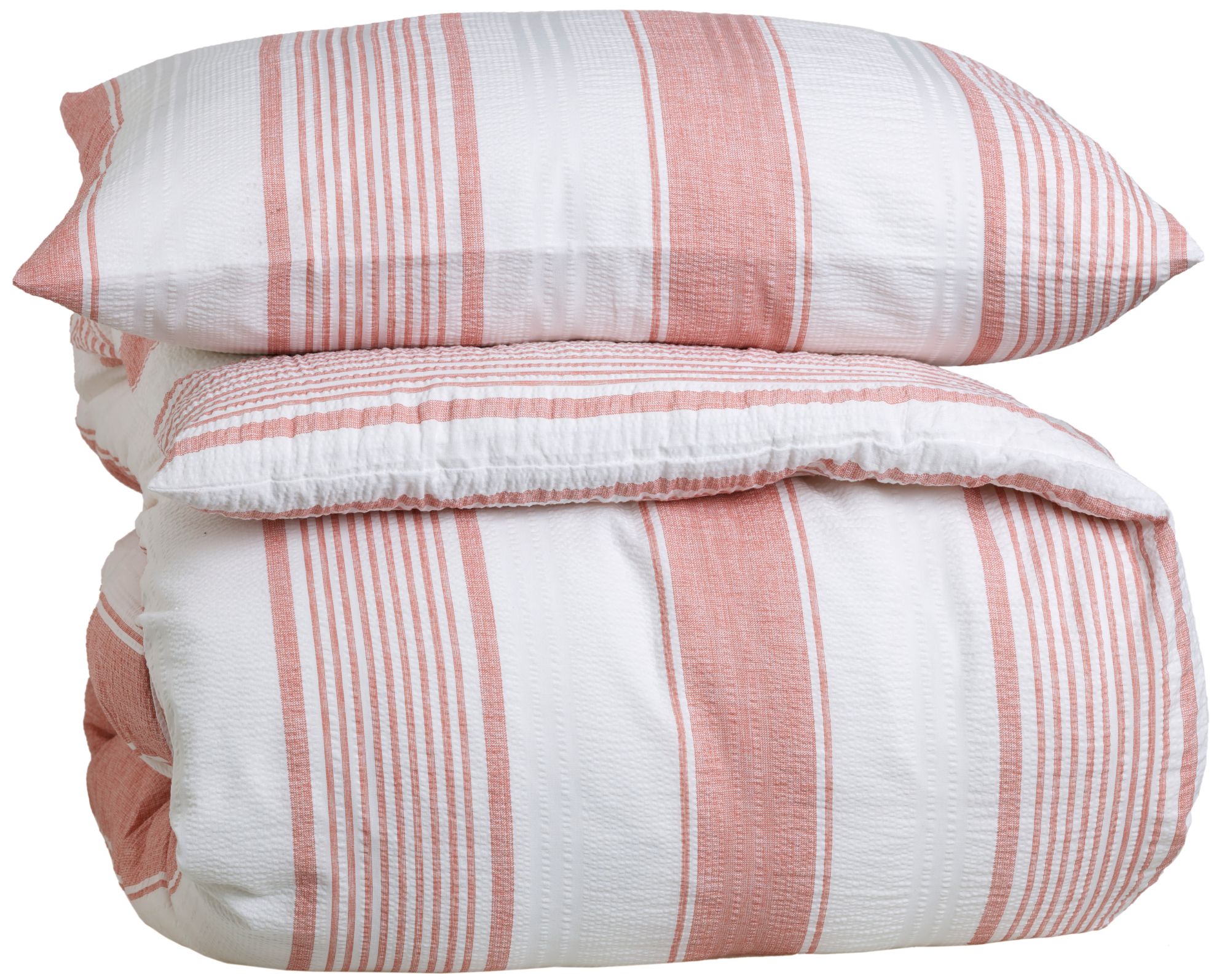 Kreppsengesett med korallrosa stripemønster på hvit bunn. Klassisk og tidløs design som gir soverommet et nostalgisk preg.