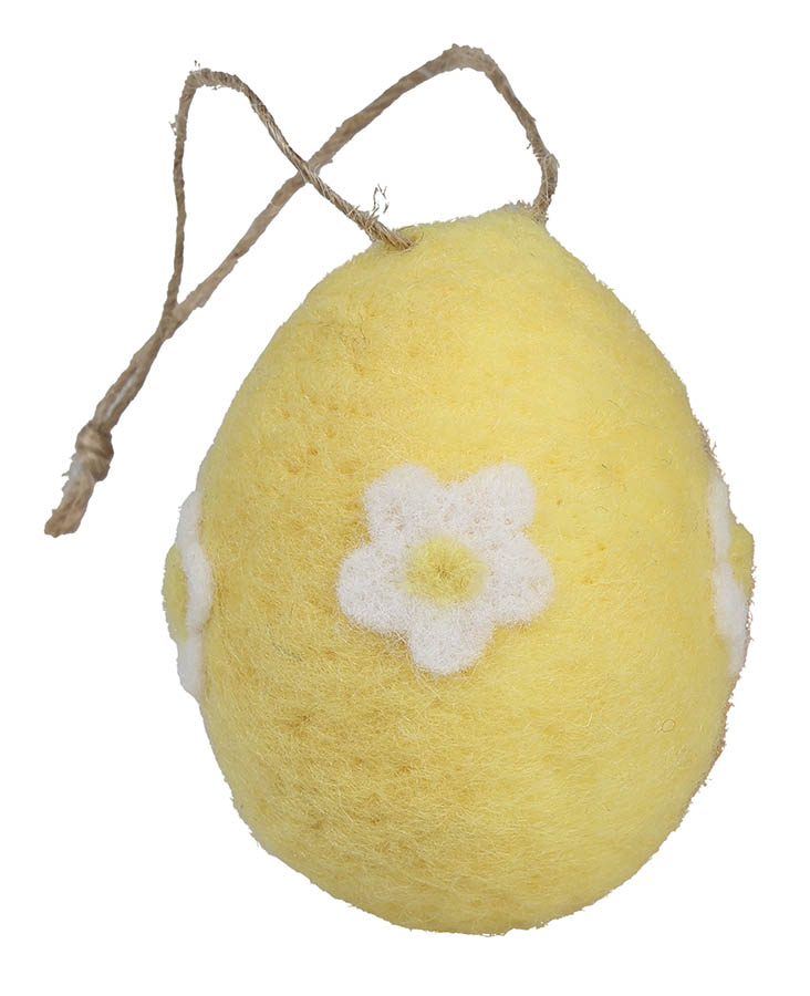 Koselig påskeegg i filt som kan henges opp. Det gule egget er dekorert med flere filtede daisier rundt egget, som gir en fin 3D-effekt og et håndlaget uttrykk. En stemningsfull påskepynt som passer like fint på påskeris, i vinduet eller som en del av en dekorativ påskeoppsats.
