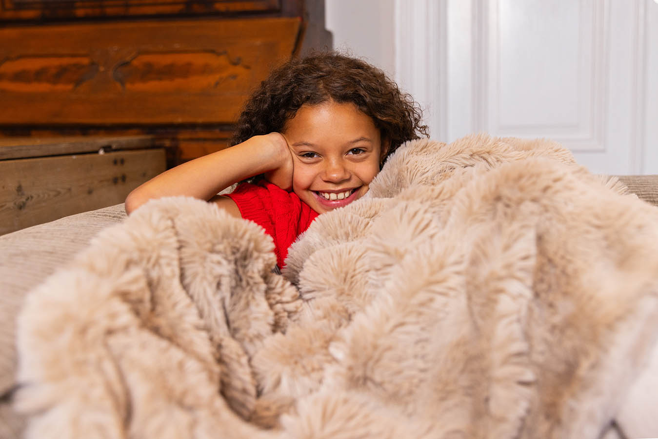 Mykt og lunt pledd i fuskepels. Imitert kaninpels på forsiden, og mink-imitasjon på baksiden. En flott innredningsdetalj som varmer godt når kvelden er kjølig.
