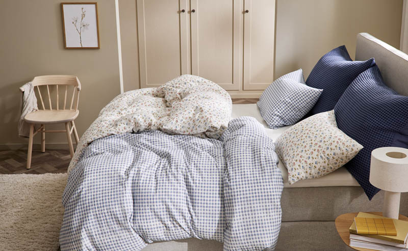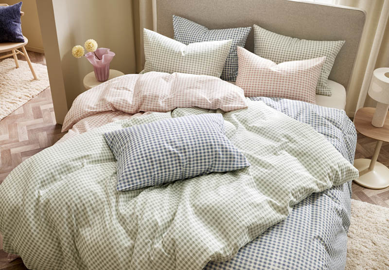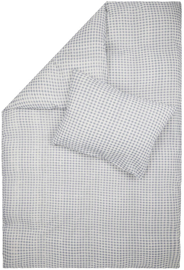Rutete sengesett i sval bomullskrepp. Det klassiske rutemønsteret gir soverommet et nostalgisk uttrykk og det bølgete stoffet føles lett og luftig mot huden – et design som er like fint på hytta som hjemme.