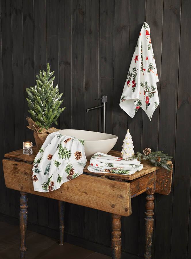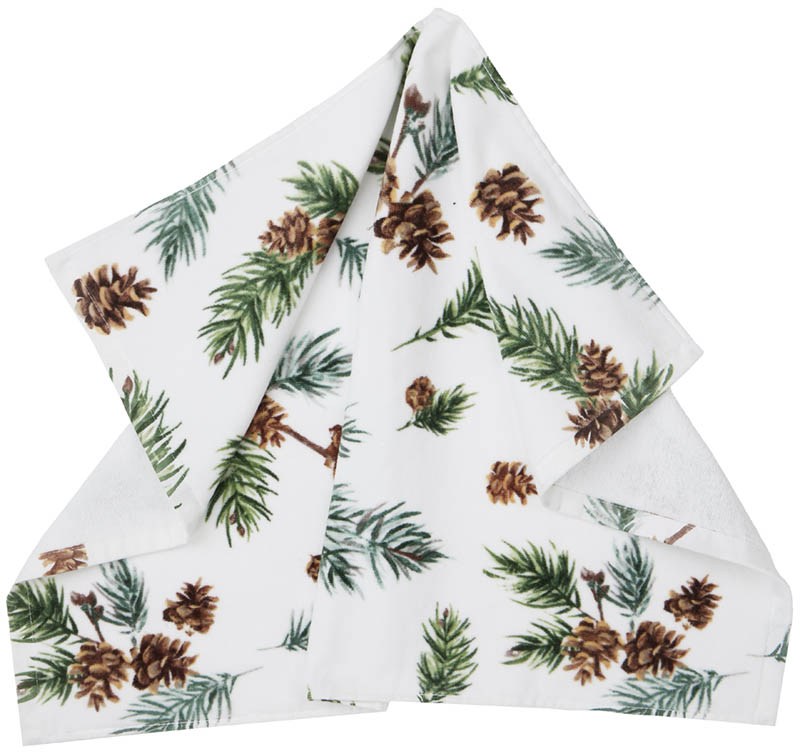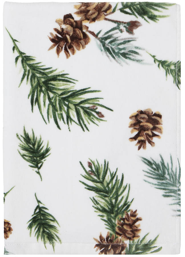 Vakkert julehåndkle med motiv av granbar og kongler. Det tidløse designet bringer naturens ro inn på badet, og passer like fint både før jul, i høytiden og utover vinteren. Perfekt både som håndhåndkle og gjestehåndkle.