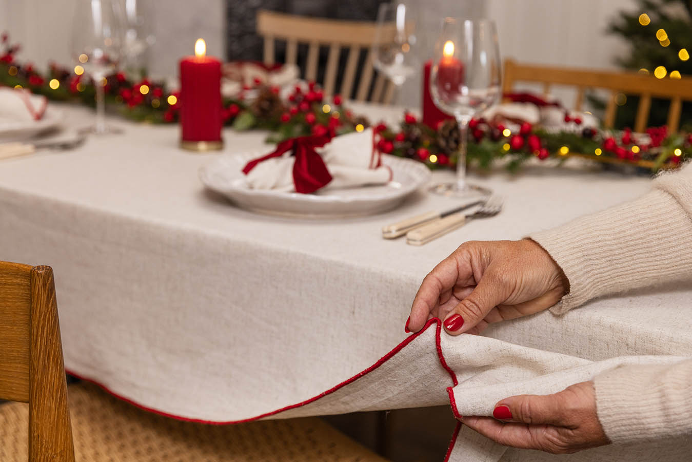 Et vakkert dekket julebord setter stemningen for en god middagsopplevelse. Lona er en naturfarget duk i linblanding med en rød, delikat søm rundt kanten. En klassisk juleduk du kan hente frem år etter år. I serien finner du også matchende tekstilservietter.