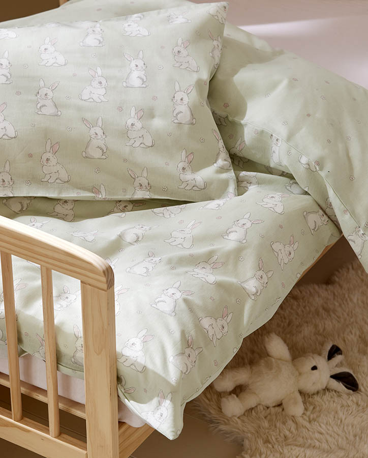 Babysengesett til vugge og barnevogn, laget av myk bomull. Forsiden er dekorert med nusselige kaniner som gjør sengesettet ekstra søtt, mens baksiden har et delikat blomstermønster. Et koselig design som garantert vil glede de minste! Finnes i flere størrelser.