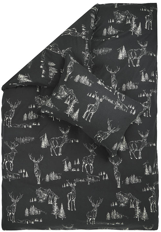 Mønstret sengesett i myk bomullsflanell. Det vakre hjortemønsteret skaper en rolig atmosfære i harmoni med naturen, mens den børstede flanellen kjennes lun og behagelig mot huden. Perfekt for deg som vil ta med naturfølelsen inn på soverommet – hjemme eller på hytta.