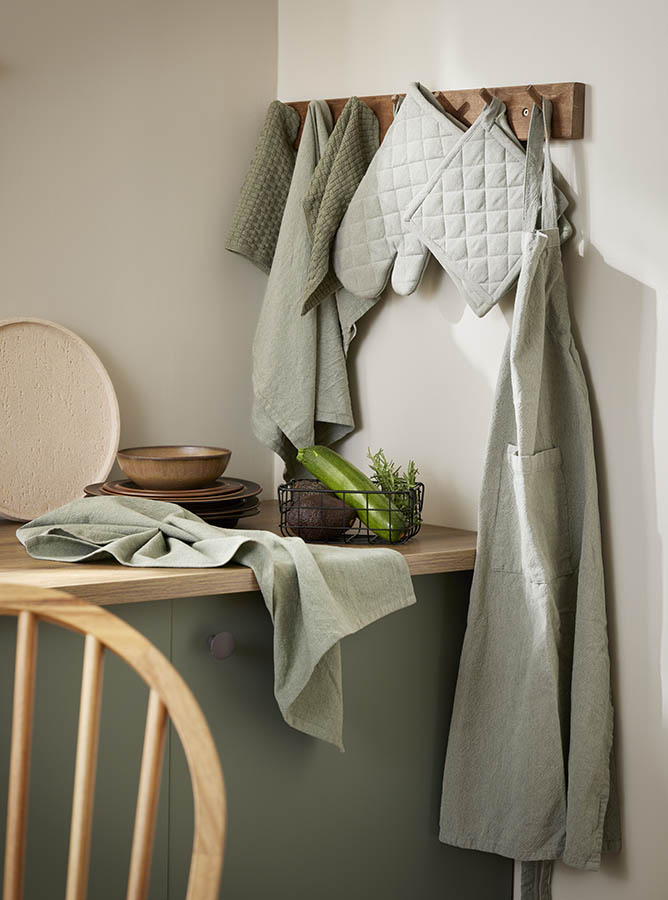 Stilig forkle i slitesterk chambray – laget med omtanke for både miljø og kvalitet. Forkleet er sydd av resirkulert bomull, og den fine, melerte overflaten gir et naturlig og stilrent uttrykk på kjøkkenet ditt. Kombiner gjerne med andre produkter fra samme serie.