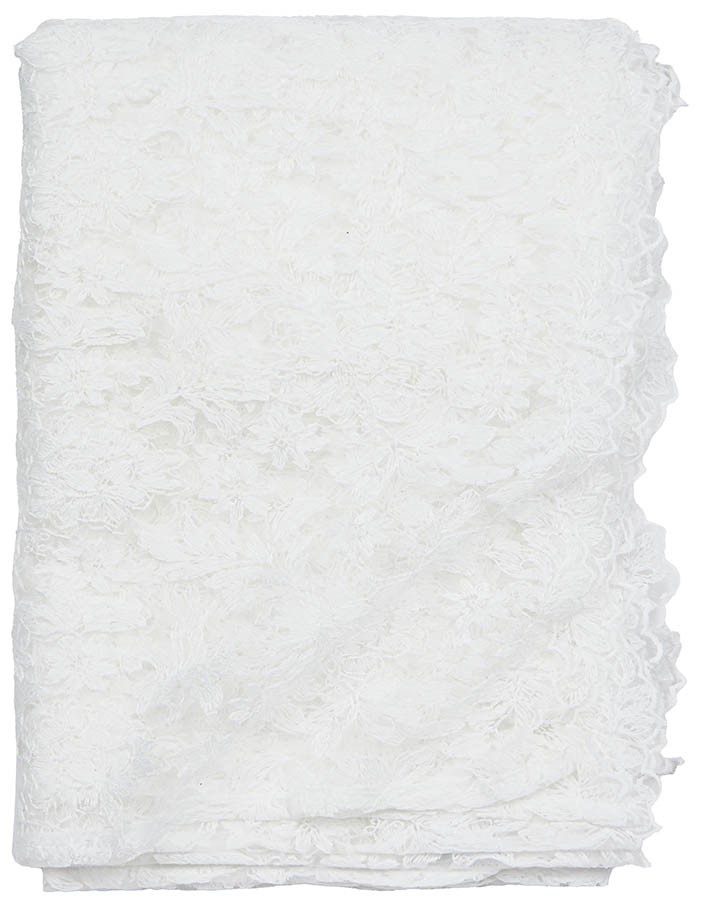 Vakker duk i blondestoff med dekorativ scallopkant. Duken gir bordet et romantisk og nostalgisk preg, inspirert av svunne tider, og passer like fint i moderne hjem som i mer tradisjonelle omgivelser.