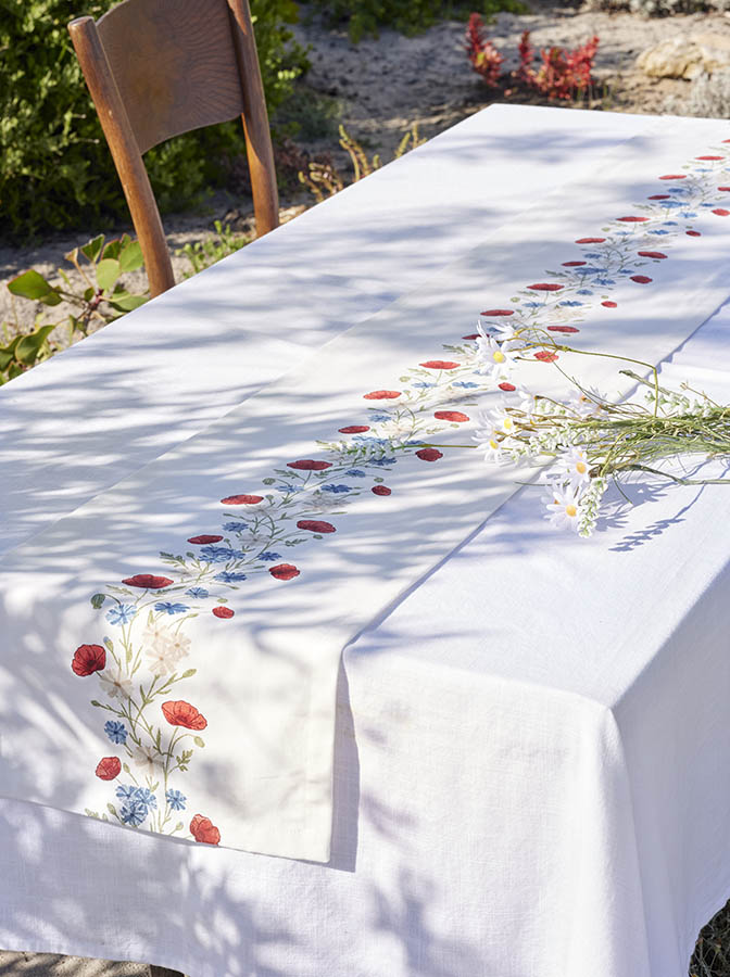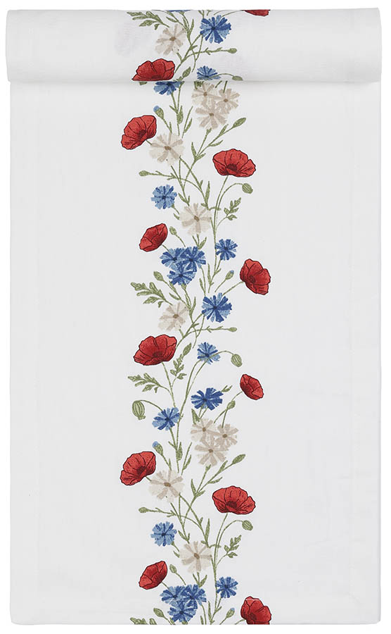 Lang og smal bordløper med blomster i rødt, hvitt og blått – et klassisk og stilfullt innslag til 17. mai. Løperen legges midt på bordet, alene eller over en større duk, og gir borddekkingen et festlig preg som passer til nasjonaldagens feiring.