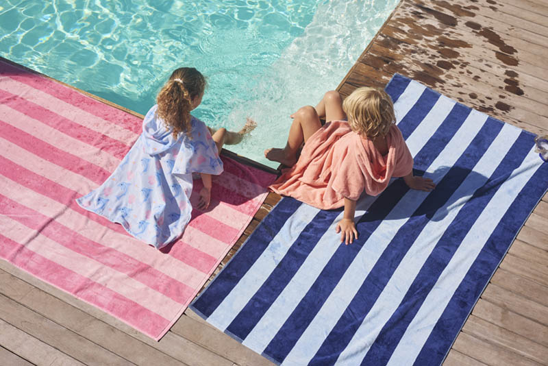Ekstra stort strandhåndkle med klassiske, garnfargede striper. Forsiden er i myk velour som gir en behagelig og luksuriøs følelse, mens baksiden i frotté absorberer godt etter bading.