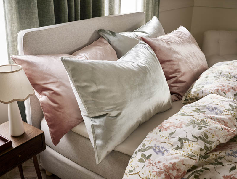 Mykt hotellputevar i tykk velour med en liten vinge rundt kanten. Den glansfulle forsiden gir sengen et eksklusivt og elegant preg, mens den matte baksiden tilfører en subtil kontrast – som et vakkert smykke på soverommet.