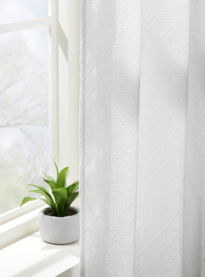 Nydelig gardin med hullstrikket pointelle-mønster. En tidløs gardin i nostalgisk stil. Like fin i alle hjemmets rom. Lettstelt kvalitet, fint fall og enkelt oppheng med maljer.