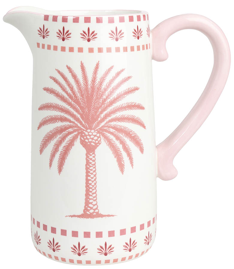 Dekorativ mugge med palmedesign som gir bordet et eksotisk preg. Ideell til servering av vann, juice og lemonade, men like fin som vannkanne til planter eller som vase til sommerblomster.