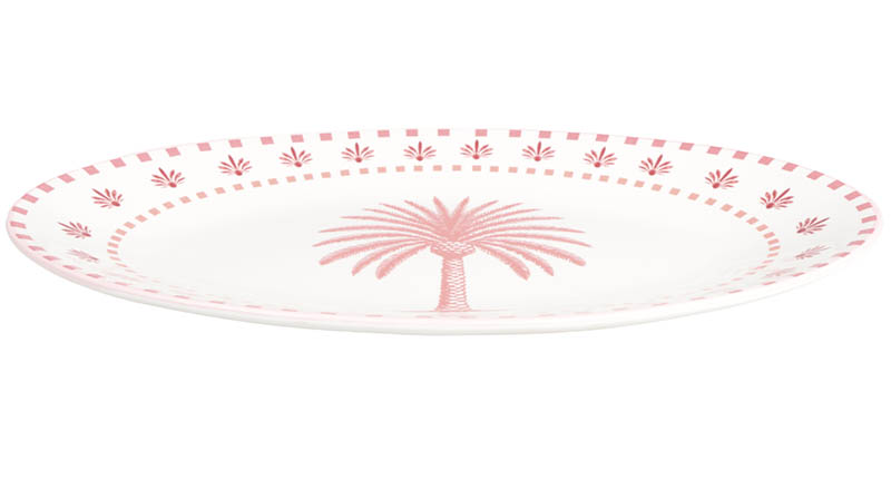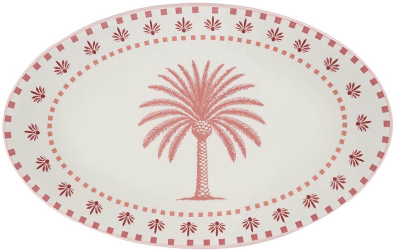 Serveringsfat med dekorativt palmedesign som gir bordet et eksotisk og sommerlig preg. Fatet har en ideell størrelse til frukt, tapas eller tilbehør til grillmaten.