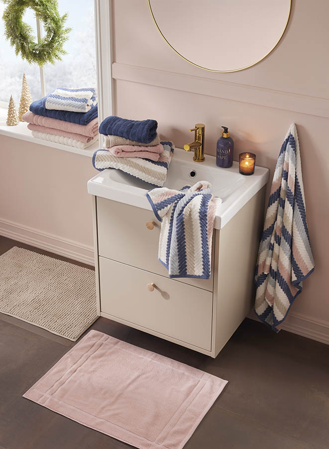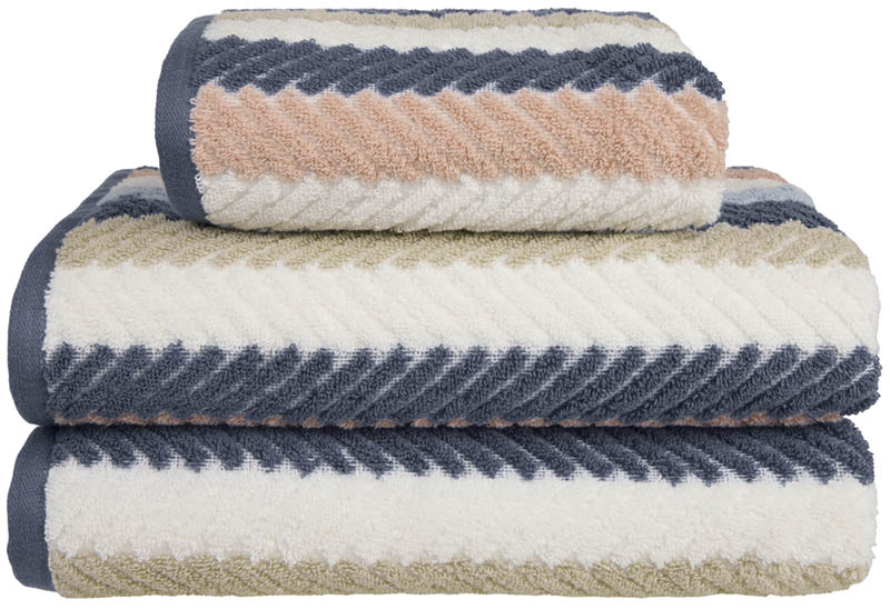 Tykt og mykt frottéhåndkle med diagonalt stripemønster i lekre farger. Den spennende teksturen gir håndkleet et unikt preg samtidig som det føles behagelig mot huden. Veveteknikken gir svært god absorberingsevne og håndkleet holder seg fint vask etter vask.