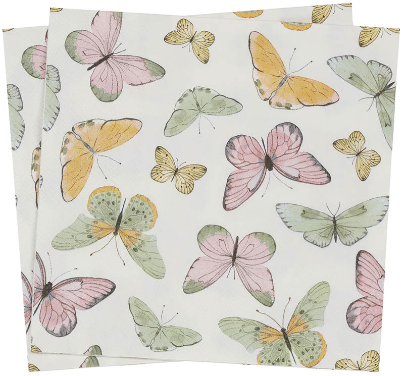 Papirservietter med rosa og grønne sommerfugler på kremfarget bunn. Det vakre motivet gir et sommerlig preg til enhver borddekking.
