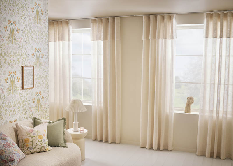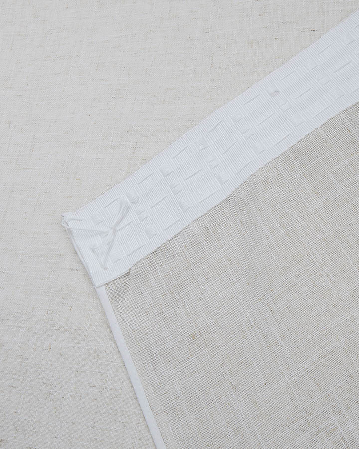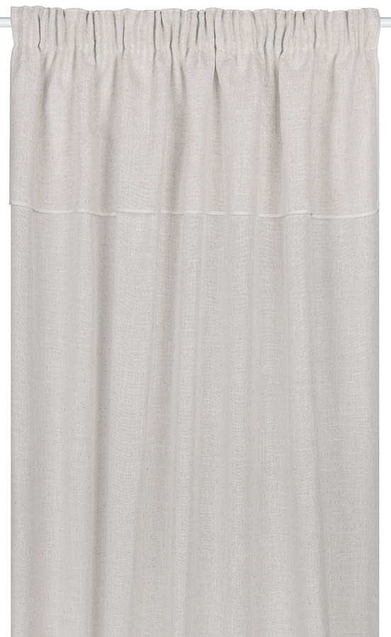 Mellomtykk gardin med kappe øverst. Stoffet har innslag av lin som tilfører tekstur og et naturlig preg, mens kappen fungerer som en dekorativ detalj som gir det lille ekstra.