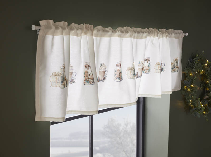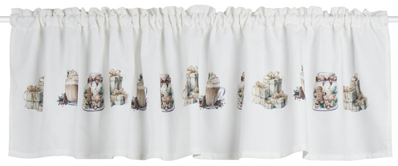 Nydelige kjøkkengardiner i tykt, lettstelt materiale med et pent fall. Gardinene er trykket med et forseggjort julemønster, rikt på detaljer som skaper en varm og nostalgisk stemning på julekjøkkenet. Gardinsettet består av en kappe og to undergardiner. Alle fagene har løpegang og kan tres direkte på stangen.